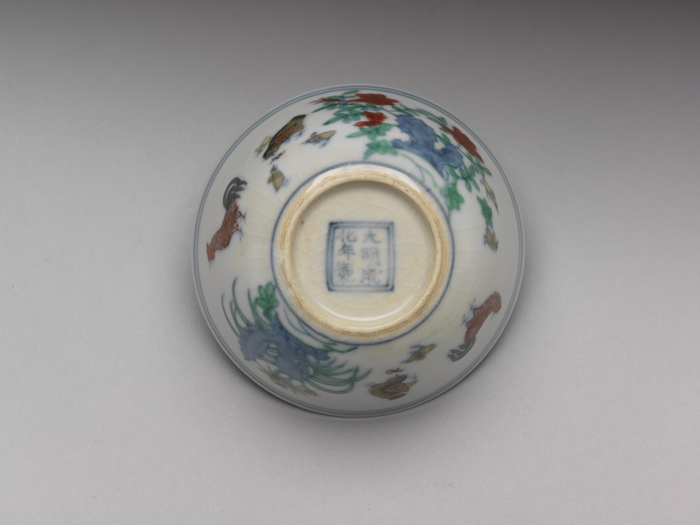 在涂睿明看来,画面之外,成型工艺也让人赞叹,却极易被忽略。“它太小了,大不赢掌,让人难以觉察工艺的高超。杯形做得精巧——鸡缸杯的缸是指它的形状像低矮的水缸,这的确是个糟糕的名字,根本无法让人联想到精巧——口沿处轻轻往外一撇,底部柔柔一收,看不到足。但这是一种巧妙的设计,把足做成内凹隐藏起来,叫‘卧足’。胎壁极薄,即使是在自然光线下,仍能轻易透过杯壁看清握杯的手指。于是,这样一只并不起眼的瓷器小杯,却肩负着开拓全新的陶瓷装饰艺术与展现数百年来最高超工艺的重任。”