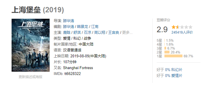 但好景不长,2018年,杨幂主演的《宝贝儿》上映,仅获得2471.2万票房;2019年鹿晗主演的IP电影《上海堡垒》号称投资3亿,但最终仅有1.24亿元票房,豆瓣评分也仅有2.9。在电视剧方面,杨幂和黄子韬主演的《谈判官》平均收视率仅有1%左右,杨洋主演的《武动乾坤》也扑得悄无声息。