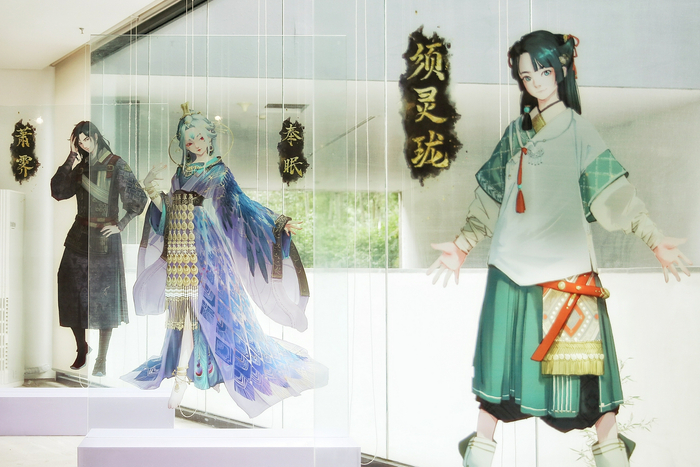 在参观的最后,观众可移步放映区观赏动画PV。记者注意到,放映室的墙面设置了动画世界观壁画的投影,展区之间也用印有原画帷幔作为隔断,更增添了丝丝唯美朦胧的“仙气”。