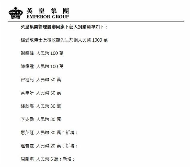 英皇集团公布的捐款名单包括:杨受成及杨政龙(1000万)、谢霆锋(100万)、陈伟霆(100万)、容祖儿(50万)、蔡卓妍(50万)、钟欣潼(30万)、李克勤(30万)、惠英红(30万)、温碧霞(20万)、周励淇(5万)。