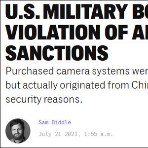 时隔近三年,美国调查新闻网站《拦截者》(The Intercept)于当地时间7月21日发表了一篇题为“美国军方购买摄像头,违反美国对中国制裁”的报道,其中揭露了许多美国联邦机构,包括军方分支机构采购海康威视和大华监控设备的事实。