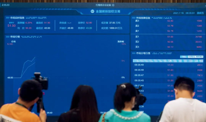建设四年的全国碳排放权交易市场,7月16日上午启动上线交易。首日开盘价为48元/吨,9时32分,首笔交易撮合成功,16万吨的交易总额为790万元。