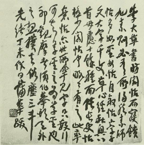 同属“海派”大佬的蒲华,与虚谷、吴昌硕、任伯年合称“海派四杰”。丙午大暑时作对联“抚凌云而自惜,扶飞仙以遨游”。用笔看似乱头粗服,逸笔草草,多不经意,但意境高古,雅逸潇洒,格调极高。伏日跋张长史《率意帖》云:“学大草书,昉阁帖而寝馈旭素,则必有所得。……此率意帖,世所罕见,字只数行,可知草圣之为草圣也耶。观摩者须作举头天外之想,扑去俗尘三斗。”可知此老平生所仰,皆是旭素正宗,与缶翁之自我作古大有不同。书风淳厚多姿,画燥润兼施,苍劲妩媚,风韵清健。蒲华书法异于同时代的任何书家。碑学大潮之下,一些书家为了塑造自我面目,努力向碑学深处开拓。邓石如、何绍基和赵之谦的实践无疑为碑派书法开辟了新路。但也出现了一些追求个性以至于走火入魔的书家。总的来看,碑学导致晚清无草书大家。正当此际,蒲华对前贤的继承和演绎发挥,无疑示范了一种成功方式,使帖学在冷落的边缘中仍存余绪。这正是蒲华书法的价值和意义所在。