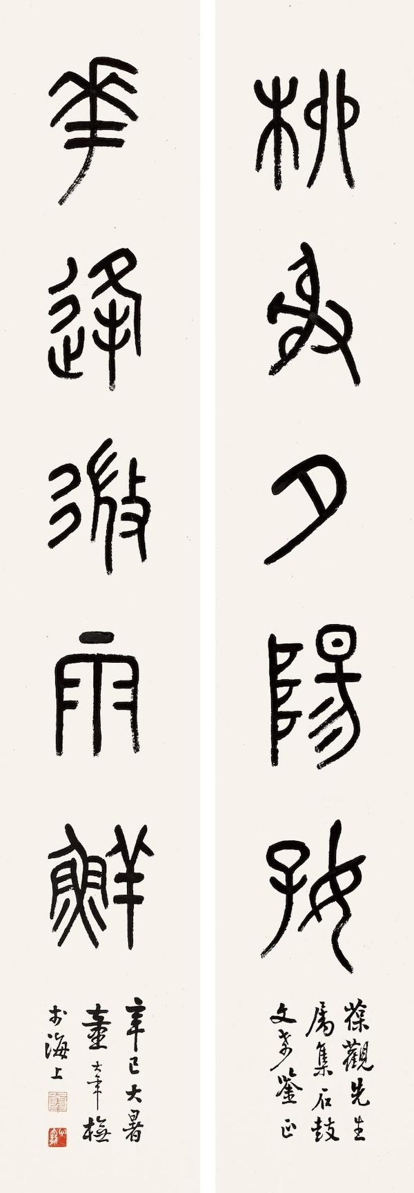 蒲华学颜,首重不是法度,而是天趣,随意放浪,在众多的学颜者中独具一格。相比之下,客居沪上的童大年,用笔显得拘谨老实。辛巳大暑应好友“葆观”之求集“柳射夕阳好,花逢微雨鲜”石鼓文对联,用笔柔中带刚,风格古朴淳厚,使人望之直如一纸精拓,故赞誉者谓之“百炼钢化为绕指柔”。