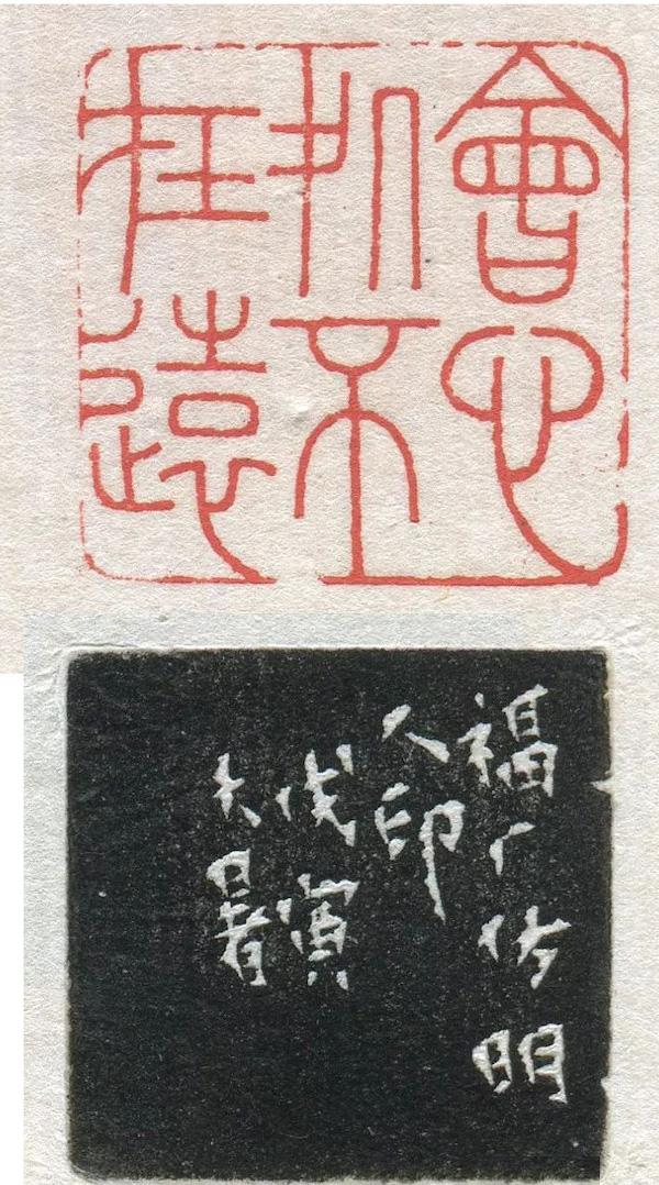 最带劲的是王福庵。在戊寅(1938)大暑乃至整个伏日期间,创作持续未停。目前所见,有一件临《㫚鼎》扇面和三方印章,时58岁。看来,老夫子真正做到“夏练三伏”,不叫一日闲过。要知道,就在1925年,王福庵不慎触电,手臂受伤,伤愈之后,端坐刻印常感不适,于是改为卧榻上镌刻。由此可见,王福庵经常躺着刻印,实是不得已而采用的姿势,不是故作高深。“会心处不在远”边款记:“福厂仿名人印,戊寅大暑”。大热天刻“银屏昨夜微寒”之类的“冰语”,心里自然有凉意。边款记:“见明人印谱中有此印,爱其静穆,酷热闷人临此,逭暑。戊寅七月朔中伏日,福庵避兵沪上并识。”第三方“小楼吹彻玉笙寒”也是有意选“凉词”,边款写道:“戊寅酷暑逼人,小楼寂坐。用南唐中主词句作印,以逭暑,不计其工拙也。”王福庵的元朱文能在林皋、汪关之后另辟蹊径,与稍后的陈巨来拉开距离,以切刀刻元朱文,清雅雍容,渊然有味,独具一格。另有一件署“癸酉年”大暑的临作,时在1933年,也是手臂受伤后的作品,却看不到一点瑕疵,用笔规整匀净、温润劲健,结体从容潇洒、瘦中寓腴,风格秀劲蕴藉,浑厚古朴,自成一家。王福庵做到了几十年如一日,值得推许。