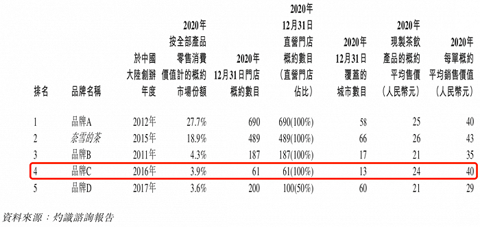 这一点可以参照奈雪招股书。一位业内人士称,从成立年份可以判断出,图中品牌A为喜茶,品牌C为乐乐茶。若这一说法准确,那么喜茶到2020年年底共有690家门店,奈雪有489家,而乐乐茶仅有61家;喜茶到2020年年底覆盖的城市数达58座,奈雪覆盖66座,乐乐茶仅覆盖13座。