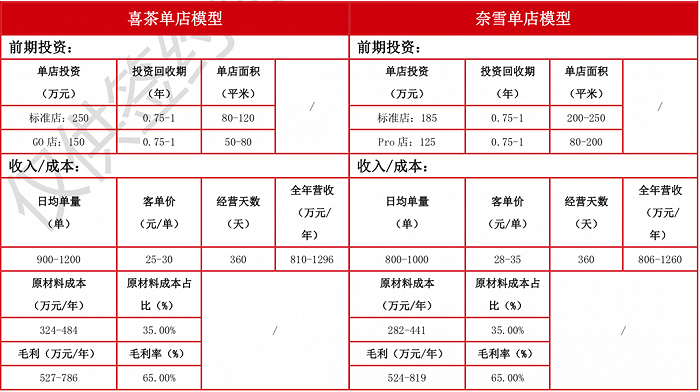 根据国融证券研究与战略发展部的报告,喜茶标准店坪效为6.75-10.8万元/米,奈雪标准店坪效为4.0-5.0万元/米;对比喜茶和奈雪的茶的单店销售模型,可以发现喜茶通过小店型(即更小的店铺面积、更少的员工薪酬与店铺租金支出)获得了比奈雪更高的单店收入、经营利润率和单店坪效。