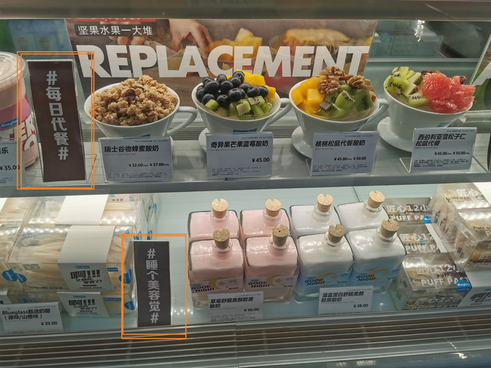 7月20日,新京报记者探访Blueglass北京西单更新场店发现,其宣传立牌上“一杯让你变好看的高品质酸奶”格外醒目。在样品展示区,不同类型酸奶被分别打上了“睡个美容觉”“胶原酸奶”“食物钻石”“每日代餐”等标签提示,25元一份的10小时冷萃酸奶、38元一瓶的草莓舒眠美颜胶原酸奶、42元一杯的蜜桃胶原玻尿酸爆珠酸奶等产品吸引不少消费者驻足。