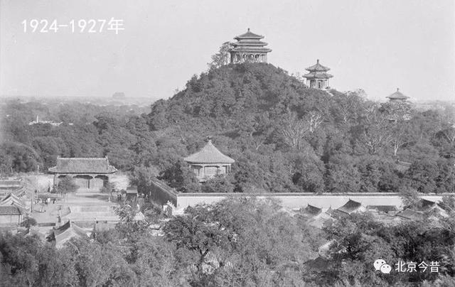 从北海琼华岛东眺景山,曾是一派郁郁葱葱的都市山林景象。如今画面背景被参差的现代建筑布满,削弱了景山的气势。