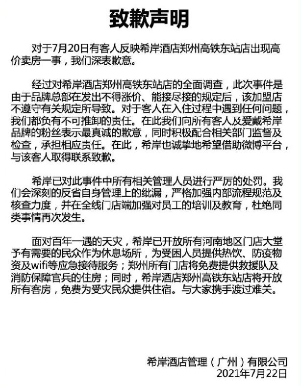 7月22日,希岸酒店道歉称,此次事件是由于品牌总部在发出不得涨价、能接尽接的规定后,该加盟店不遵守有关规定所导致。目前,品牌正联系4名客人全部退回所卖收入。