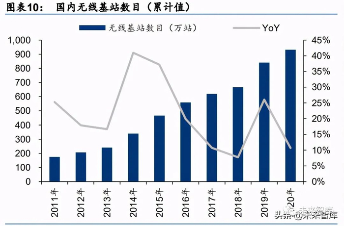 伴随着 3G/4G、FTTH 的建设,国内基础设施日渐完善。2020 年国内无线基站累计达到 931 万站,较 2011 年增长 431%,2011~2020 年复合增速为 20.9%;互联网接入端口 2020 年 累计到 9.5亿端,较 2011 年增长 403%,2011~2020 年复合增速为 17.5%。