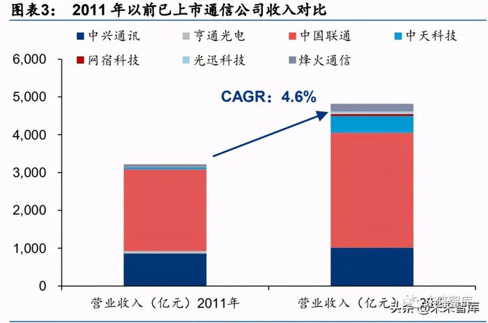 分析 2020 年通信行业增量市值(较 2011 年)的结构,其中 2011 年以前已上市的公司贡 献了增量市值的 28.24%,剩余部分由新上市公司贡献。截止 2020 年末,2011 年初已经上 市公司对应市值总额为 6052.4 亿,较 2010 年末增加 2040.8 亿,其中中兴通讯、亨通光电、 中国联通、中天科技、网宿科技、光迅科技、烽火通信贡献了绝大部分增量市值,上述公 司受益于国内通信网络(3G/4G 无线基站、FTTX、CDN)建设以及产业升级(光纤光缆一 体化整合、光器件国产化率提升),营收及归母净利润持续增长带动总市值稳步提升。