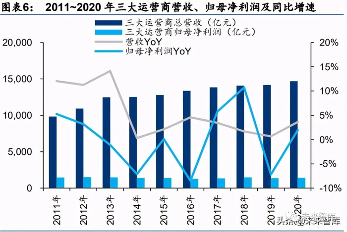 相较之下,三大运营商(港股)在过去十年内,总市值呈现出下滑趋势。我们认为用户增 长放缓、行业竞争加剧叠加流量变现缺少有效途径弱化了运营商业绩增长潜力(2011~2020 年,三大运营商营收复合增速为 5.28%,归母净利润复合增速仅为 0.14%),最终导致其总 市值呈现下滑趋势。
