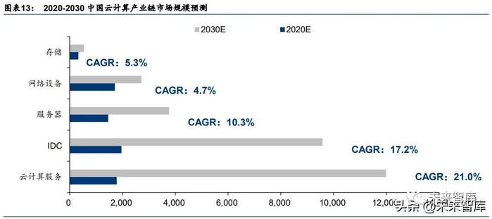 (1)企业需求和 市场环境驱动云计算市场规模增长,我们预计到 2030 年中国云计算服务市场规模有望达 11,987 亿元,2021-2030 十年 CAGR 为 21.0%;