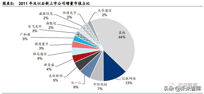 截止 2020 年末,2011 年及以后新上市公司对应市值总额为 5185.3 亿元,其中亿联网络、 中际旭创、七一二、光环新网、新易盛、移远通信、广和通、国盾量子等贡献了绝大部分 增量市值。从所属细分领域来看,上述公司集中在云计算、物联网、企业视频等领域,受 益于流量增长、企业信息化水平提升以及中国工程师红利构建起的全球比较优势。