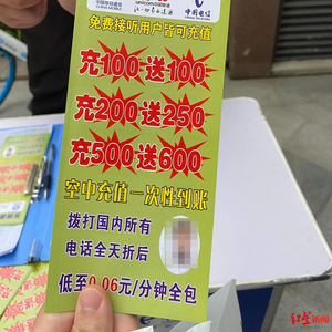 现场的“工作人员”向李女士介绍,三大运营商在搞活动,话费充值“充多少送多少”。在对方递给李女士的传单上,最上方写着“亲情通IP充值卡”,下面印着移动、联通、电信三个运营商的标志,中间还用红色大字标出“充100送100、充200送250、充500送600”的优惠。