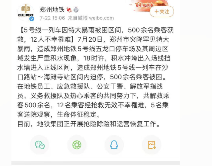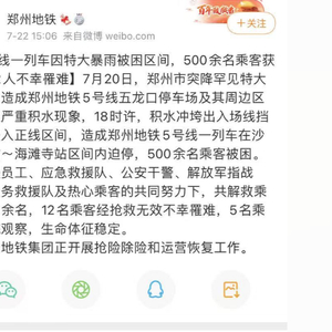 根据郑州地铁官方微博22日下午发布的消息,7月20日,郑州市突降罕见特大暴雨,造成郑州地铁5号线五龙口停车场及其周边区域发生严重积水现象,18时许,积水冲垮出入场线挡水墙进入正线区间,造成郑州地铁5号线一列车在沙口路站~海滩寺站区间内迫停,500余名乘客被困。在地铁员工、应急救援队、公安干警、解放军指战员、义务救援队及热心乘客的共同努力下,共解救乘客500余名,12名乘客经抢救无效不幸罹难,5名乘客送院观察,生命体征稳定。