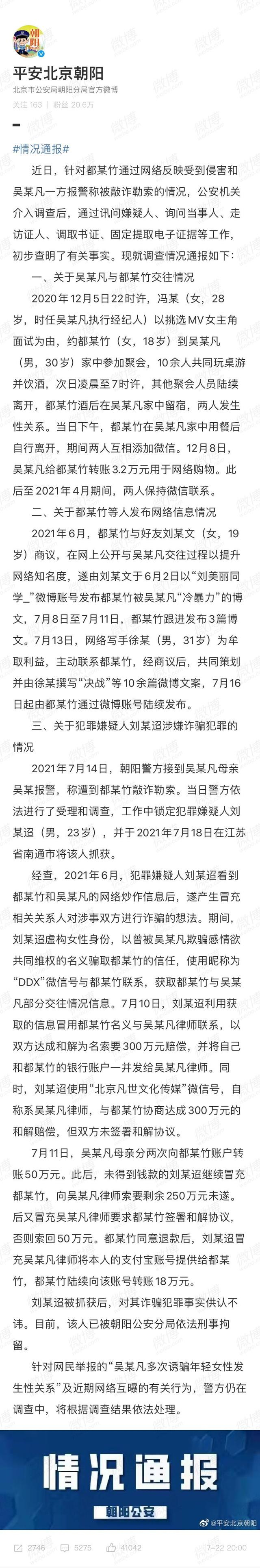 7月22日,北京朝阳警方发布了针对都美竹通过网络反映受到侵害和吴亦凡一方报警称被敲诈勒索的情况通报。经过警方调查,吴亦凡和都美竹确有过两性关系发生,2021年6月,都某竹为了提升网络知名度,先后在网上发布被吴亦凡“冷暴力”的博文。