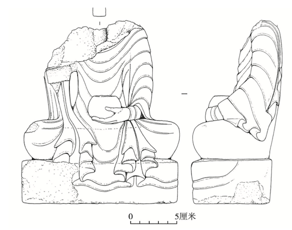 〔图三〕成都万佛寺出土梁朝坐佛像正面及左侧面实测图 四川博物院藏 川博21838号 采自《 四川出土南朝佛教造像》 图17
