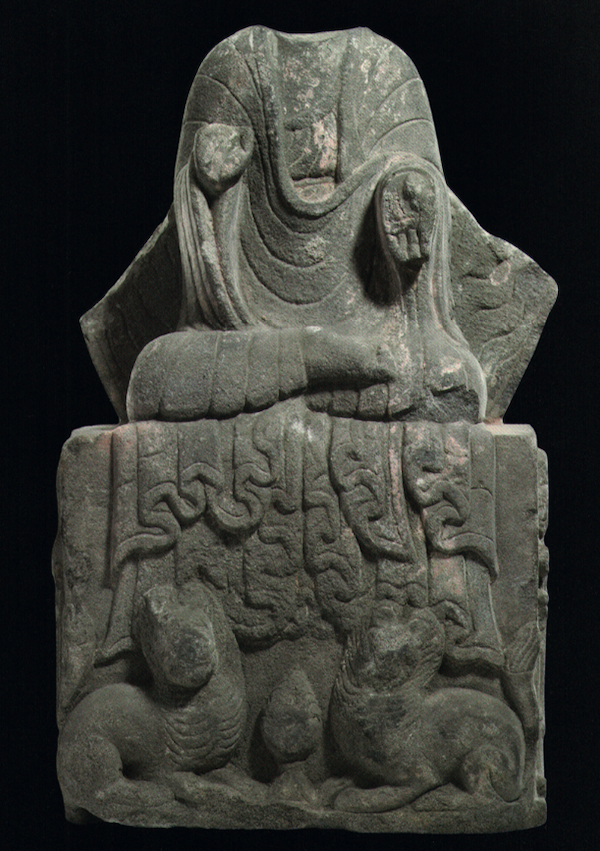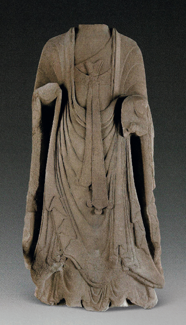 隋初在敦煌出现捧钵药师佛图像当是6世纪药师佛图像的一个飞跃,奠定了后代药师佛像样式。那么,这种图像是否可以上溯到南北朝时期?2014年,在成都下同仁路发现南朝至唐代佛教造像坑,共发现石造像127件,包括佛、菩萨、力士、天王、罗汉,四件有梁朝纪年,分别为天监十五年(516)、普通五年(524)、中大同二年(547)、天正三年(553)。另有北周天和三年(568)杨解□造观世音菩萨像,与该菩萨像装饰相似的立菩萨像还有不少,可知这个埋藏坑中的造像很多属于梁朝和北周。其中有一尊结跏趺坐佛像(编号H3:34)为青砂石质,残高20厘米,头颈和右胸、右手已残,原似施无畏印,左手于腹前托钵,着通肩式大衣,衣纹呈向上的圆弧形,大衣下摆垂覆于台座前两层〔图十五〕。具有相似服装和衣纹的梁朝佛像可见于成都万佛寺出土的四川博物院藏113517、113524号立佛像,该坐佛大衣下摆在座前垂覆的风格则与成都商业街出土的约造于梁朝的两件背屏式造像(成考所90CST5:4、90CST5:5)主佛大衣下摆相似。因此,这尊坐佛像很可能造于梁朝,当然也有少许可能造于北周,只是继承了更多的梁朝风格。由于缺乏铭文题记,该佛的确切题材尚难以辨明。无独有偶,四川汶川县文管所收藏的一件梁朝背屏式造像主尊三佛中的右佛也以手捧钵。它们虽然同隋代以后流行的捧钵药师佛像相似,但还不能断言一定是药师佛,因为成都西安路出土的一件梁朝背屏式造像(成考所H1:6)三尊主佛中的两尊均于腹前捧钵,显然不可能都是药师佛了。但我们也不能排除成都下同仁路这尊捧钵佛像为药师佛的可能性,因为隋唐捧钵药师佛图像的形成很可能有南北朝之渊源。这一问题有待将来的考古发现进一步证实。