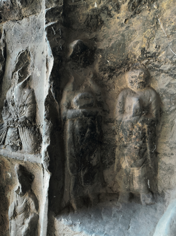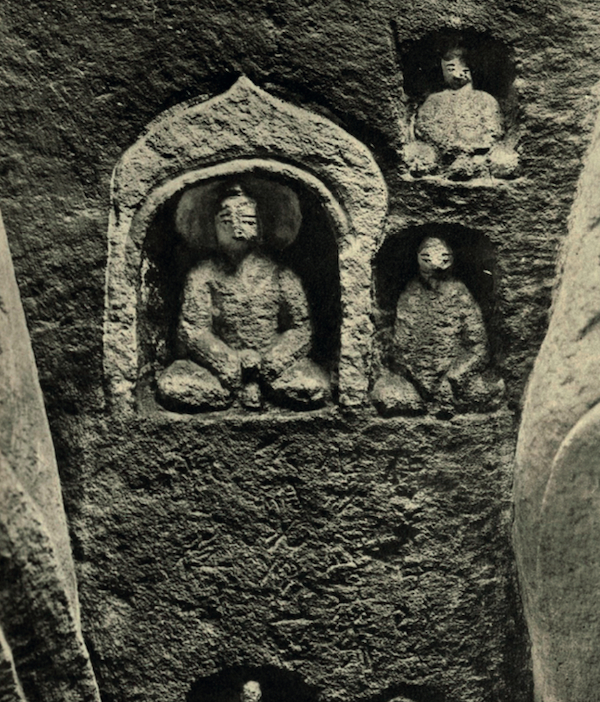 〔图七〕山西大同云冈石窟第11窟西壁中部 北魏七立佛像之第四、五身之间的药师佛龛 采自[ 日] 水野清一、 长广敏雄:《 云冈石窟》第11洞, 图版65A
