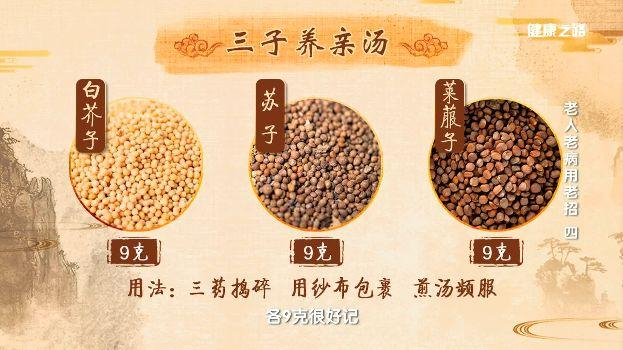 三子分别为苏子、莱菔子、白芥子。苏子是紫苏的种子,有降气化痰、宣畅气机的作用;莱菔子是萝卜的种子,有化痰行气、消食除胀、开脾胃的作用;白芥子是芥菜的种子,能够温肺化痰。