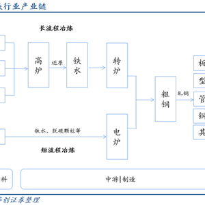 钢铁冶炼工艺通常可分为两种,即“长流程”和“短流程”。其中,“长流程”原材料主要为铁矿石、焦炭和喷吹煤,原材料经高炉冶炼变成铁水,再由转炉炼制成粗钢;“短流程”则主要以废钢为原材料,加以铁水经过电炉冶炼可产出粗钢。由于“短流程”所需废钢及电炉电费高,成本较之“长流程”较高,目前我国广泛运用的仍为“长流程”冶炼法。