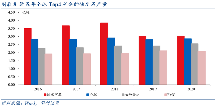 进一步从铁矿石厂来看,国外的淡水河谷、力拓、必和必拓、FMG四家矿企基本垄断了铁矿石的供应,2020年合计产量为10.49亿吨,占全球铁矿石产量的44%。