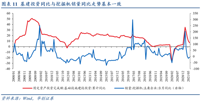 建筑业为钢铁的主要下游行业,包括房地产和基建。房地产行业主要用钢品种包括螺纹钢和线材,可用房地产开发投资完成额作为房地产行业需求的同步判断指标。受疫情影响,2020年房地产开发投资额累计同比大幅下降,粗钢产量累计同比也随之下降。基建行业用钢主要集中在交通板块,以“铁公机”为代表的交通大类在过去很长时期内,始终是我国基建的最重要投向,一般可用挖掘机销量作为基建需求的前瞻性指标。