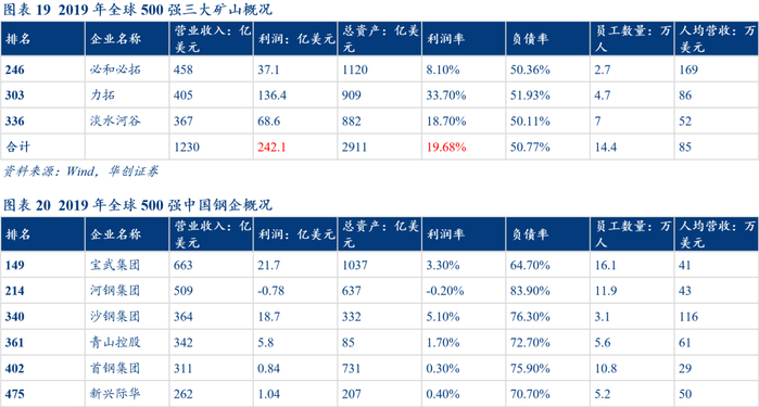 此外,通过对比2019年全球500强中国钢企、三大矿山的财务数据可以发现:我国钢铁企业利润规模较小,利润率普遍偏低。全球500强的6家中国钢企利润总额合计仅为海外三大矿山的五分之一,且整体利润率仅为1.93%,不及三大矿山利润率19.68%的十分之一,主要系我国钢铁企业的议价能力较差,行业大部分利润被上游矿企汲取所致。当前来看,我国钢铁行业发展大趋势为并购整合扩大产能规模,不断提升我国钢铁企业在产业链中的话语权。