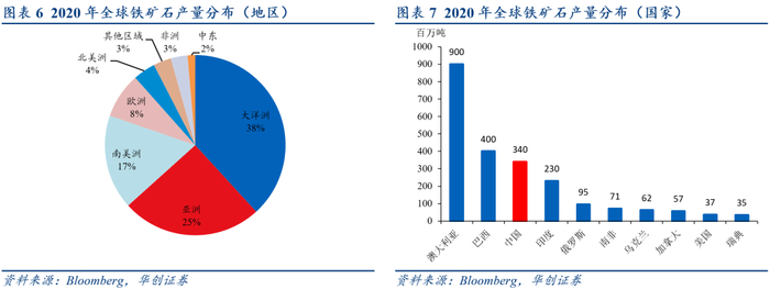 全球铁矿石产量分布集中,我国钢铁企业对铁矿石的议价能力较弱。2020年全球铁矿石产量为24亿吨,主要分布在大洋洲、亚洲、南美洲及欧洲,CR4集中度约为88%;从国家来看,澳大利亚的铁矿石产量位于全球第一,高达9亿吨,其次为巴西、中国和印度,分别为4亿吨、3.4亿吨和2.3亿吨,合计占比79%。整体来看,我国铁矿石产量较高,但同时消费量较大且品位相对不高,所以仍需大量进口铁矿石。