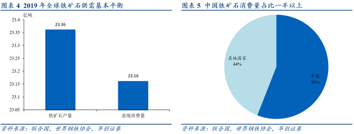 全球铁矿石供需基本平衡,我国消费量占比一半以上。2019年全球铁矿石产量为23.36亿吨,表观消费量为23.16亿吨,产量略高于消费量,全球铁矿石总体供需平衡。2019年亚洲铁矿石消费量占全球铁矿石消费量的75.23%,其中中国铁矿石消费量居世界第一,占全球铁矿石消费总量的55.96%。我国对铁矿石需求较高,且基本依赖于进口,海外铁矿石价格波动将直接影响我国钢铁行业盈利水平。