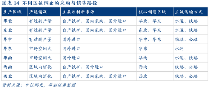 从原材料采购与钢材销售区域来看,华北、东北、西南等地区由于铁矿资源较为丰富,铁矿石部分来源于自产,而华东、华中、华南等地区铁矿资源相对匮乏,主要原材料基本依赖国外进口。此外,华东、华南、西南、西北地区钢铁企业的核心销售区域都在本地,而华北、东北、华中依靠便利的运输方式与较高的钢铁产能,均以本地与华东地区作为核心的销售区域。