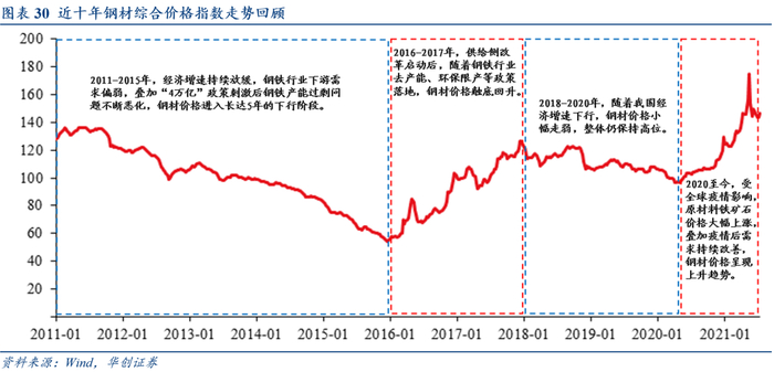 钢材价格作为衡量钢铁行业景气度的重要指标,可以较为直观地反映钢铁行业的发展状况与趋势演变。因此,以史为鉴,分析钢材价格历史走势有利于我们进一步加深对钢铁行业的理解,以期对未来行业发展趋势做出一定研判。通过对近十年钢材价格的复盘,我们可将钢价走势大致分为以下四个阶段: