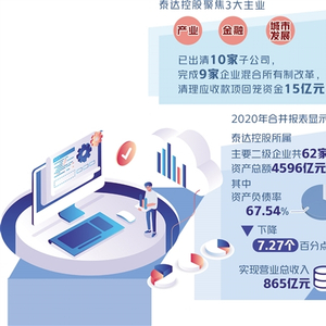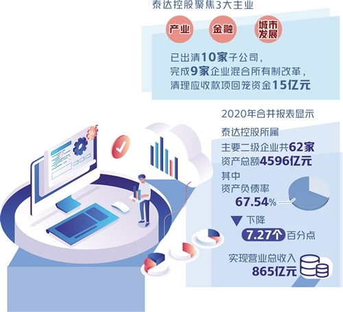 目前,泰达控股聚焦产业、金融和城市发展三大主业,已出清10家子公司,完成9家企业混合所有制改革,清理应收款项回笼资金15亿元。2020年合并报表显示,泰达控股所属主要二级企业共62家,资产总额4596亿元,其中资产负债率67.54%、下降7.27个百分点,实现营业总收入865亿元,利润总额43亿元,同比增长87%。