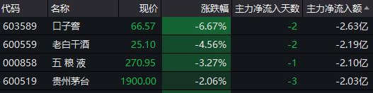 从资金流向来看,截至发稿,白酒指数遭主力资金净流出超13亿元,口子窖、老白干酒、五粮液、贵州茅台均遭主力抛售逾2亿元。其中,贵州茅台已连续3日遭主力净流出。