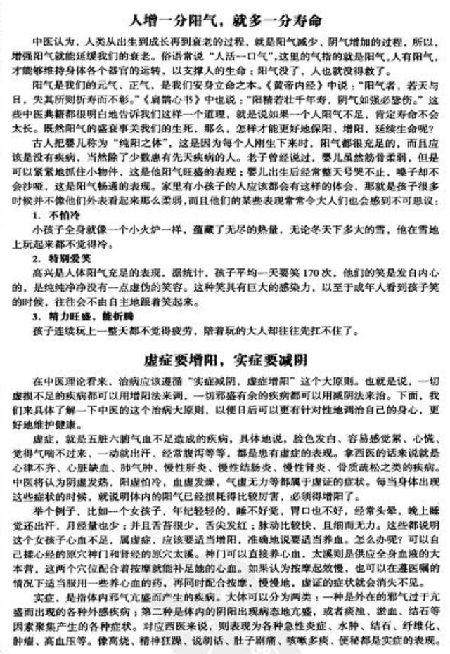 我是真一,如果你想了解更多中医养阳气的知识,我可以免费送你一本畅销百万册的《阴阳一调百病消大全集》,本书指出了养生的宗旨就是要维护身体的阴阳平衡。在中医阴阳寒热理论的基础上,讲解不同人群不同的养生方式,指导春夏养阳,秋冬养阴,用温凉寒热不同属性的食物等调节身体,是很不错的家庭养生书。