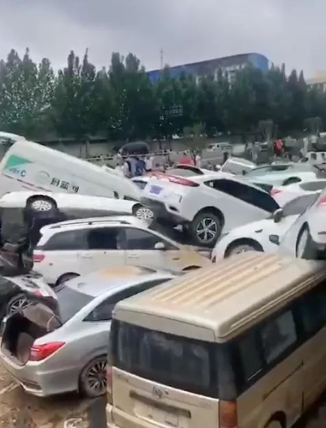 伴随着洪水下降,大量被浸泡的车辆开始露出水面,一些车辆已经被洪水冲得东倒西歪,一些车辆被直接冲翻了,还有一些车辆,则在洪水的作用下,如同叠加罗汉一般,累积在一起。