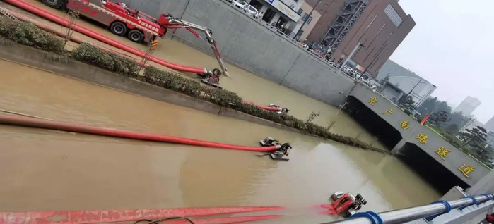 7月21日,伴随着大雨减弱,洪水涨势渐小,中国安能下属湖北、重庆、唐山等多个救援基地的近百名救援人员携带多台“龙吸水”(大型抽水设备)赶赴京广路隧道,对京广北路隧道、京广北路隧道、淮河路隧道等三个隧道内约50万方水(相当于一个小型水库)进行抽排。