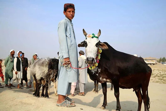 2021年7月17日,阿富汗贾拉拉巴德,一名男子牵着牛在当地集市售卖。图|IC photo
