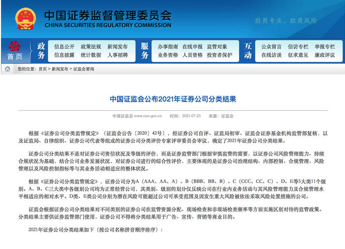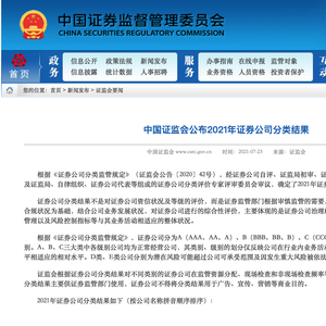 7月23日晚间,2021年证券公司分类评价结果出炉。