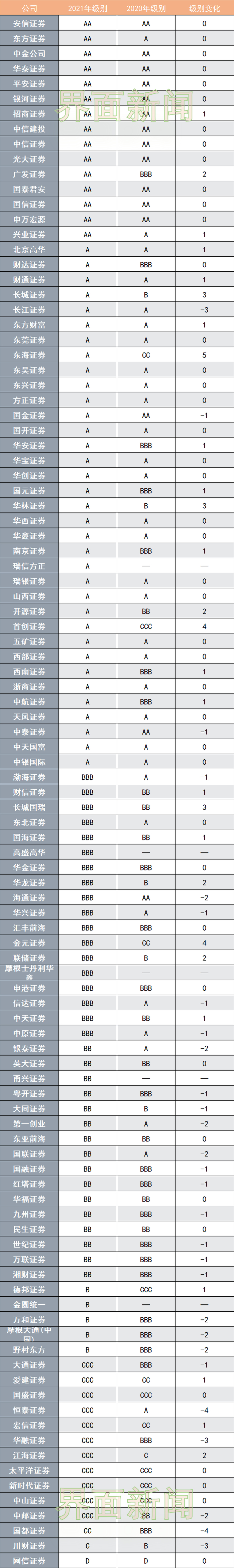 原标题:2021年证券公司分类评级来了!AA级15家,海通连降两级成“最惨”头部券商