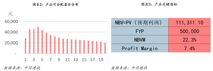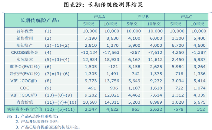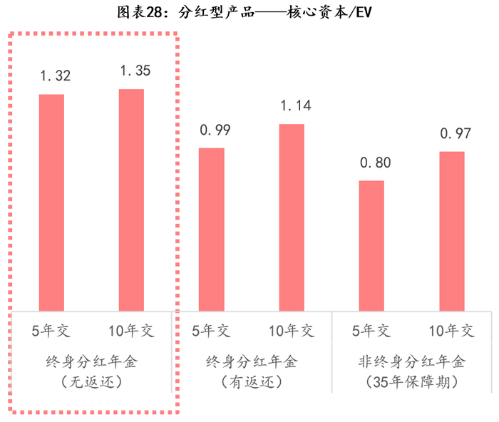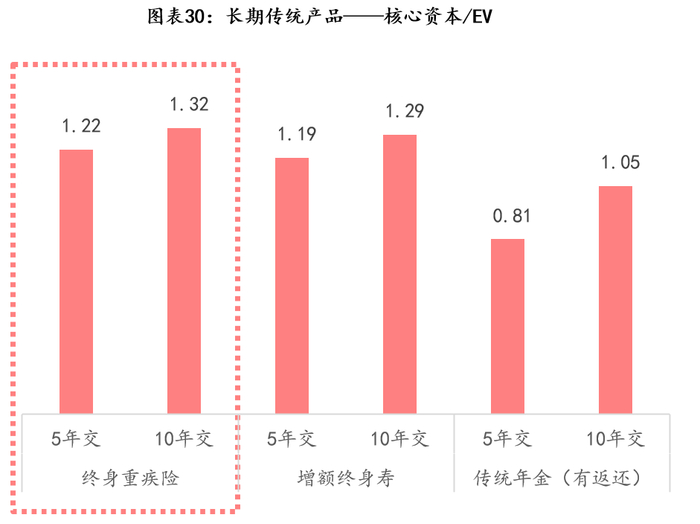 3)长期传统产品的核心资本、EV贡献最大,且风险价值比也是最高的,代表1单位利润的风险最低。其中,风险价值比最高的依然是长期期缴产品,重疾险最高、其次为终身寿等储蓄类产品,而设置提前返还的传统年金较低。