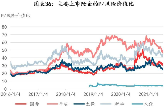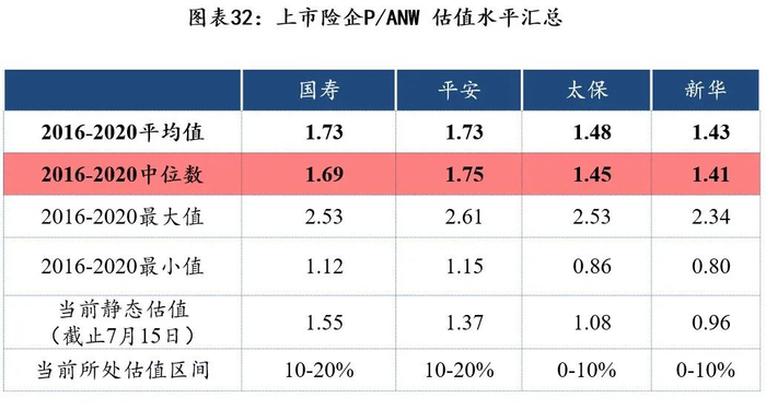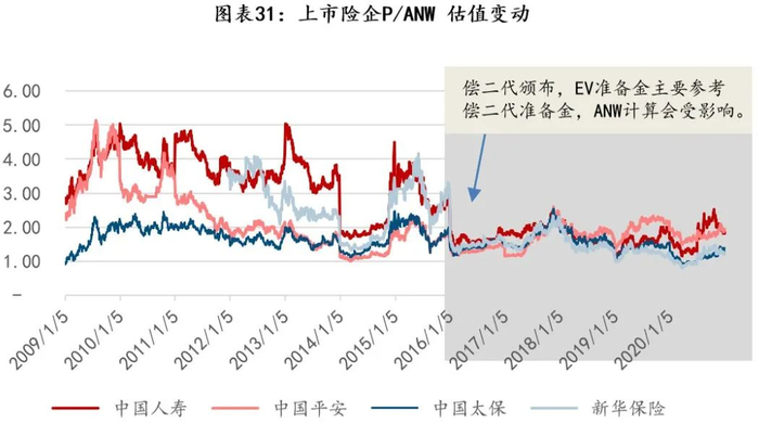 如果不考虑未来假设的影响,剔除VIF、不考虑未来NBV增速,仅以EV体系下的ANW作为估值底,近五年来主要上市险企估值水平:平安>国寿>太保>新华。