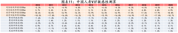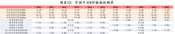 EV估值体系体系建立在系列最优估计假设上。在各类假设中,贴现率、投资收益率假设对VIF的影响最大,其中投资收率的波动对VIF的影响最大。