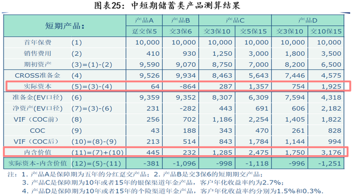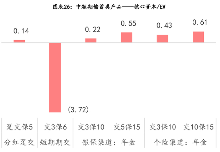 1)中短期储蓄类(5-15年保险期间)产品:核心资本/EV 比值小于1、且可能为负。