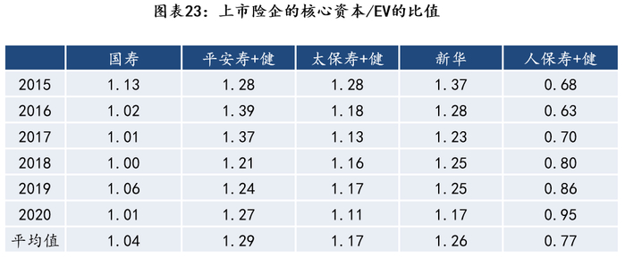 因为保险公司业务存在长周期性,当期的业务策略需要经历一定时间才能真正显示其盈利情况。为了更好的判断保险公司的业绩,需要将EV与核心资本结合来看。通常保险公司的核心资本普遍高于EV。主要受税、折现率等因素影响:1)核心资本的计算中会扣掉10%剩余边际(对于连续盈利三年以上的公司)作为税务成本;EV下可分配盈余的税率为25%。大部分公司的10%剩余边际