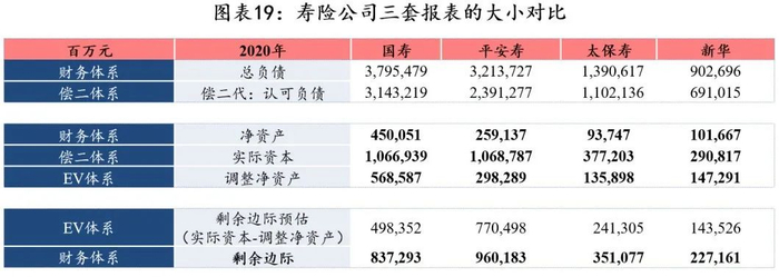 2)上市险企2020年净资产普遍低于EV下的调整净资产,且均显著低于偿二体系下的调整净资产。