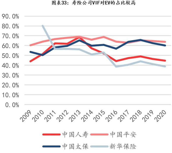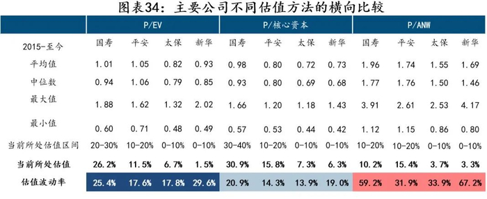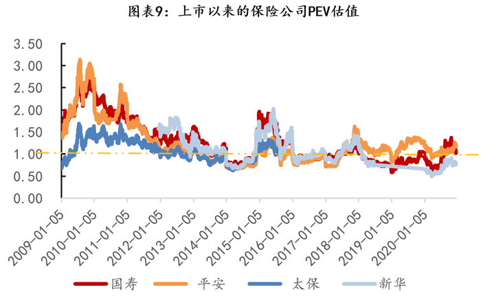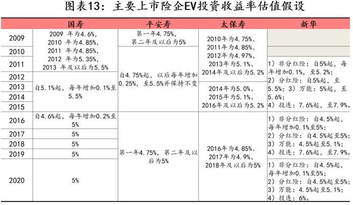 但不同公司、同一公司在不同阶段的投资收益率、贴现率的最优估计假设不同,导致基于此类假设得到的VIF、NBV或EV在不同公司、在同一公司的不同阶段可比性较差。这也是资本市场对PEV估值假设打折的原因之一。