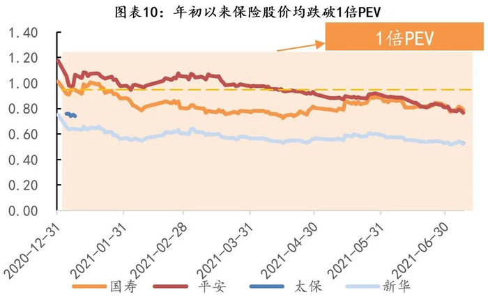 上市以来保险公司的估值以PEV为主,EV作为“清算价值”是保险公司的估值底。而年初以来,受负债端业绩增速下滑的拖累,保险股PEV估值持续低于1倍。截止7月15日,主要上市险企的PEV倍数为:国寿(0.71x)、平安(0.76x)、太保(0.53x)、新华(0.53x),当前估值低于1倍PEV。